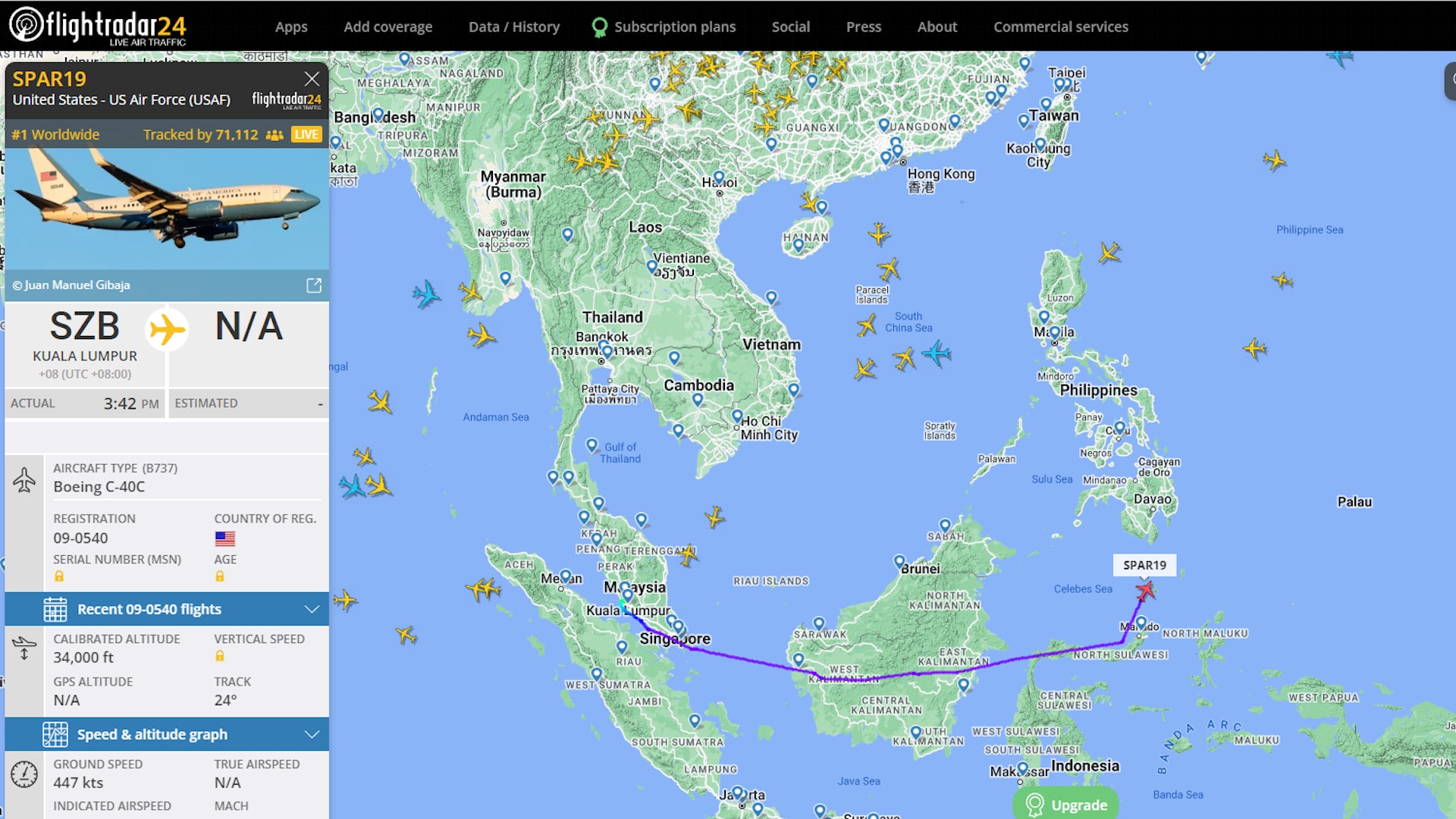 佩洛西疑似專機 SPAR19飛印尼上空後北行 33萬人湧網站追蹤大塞車